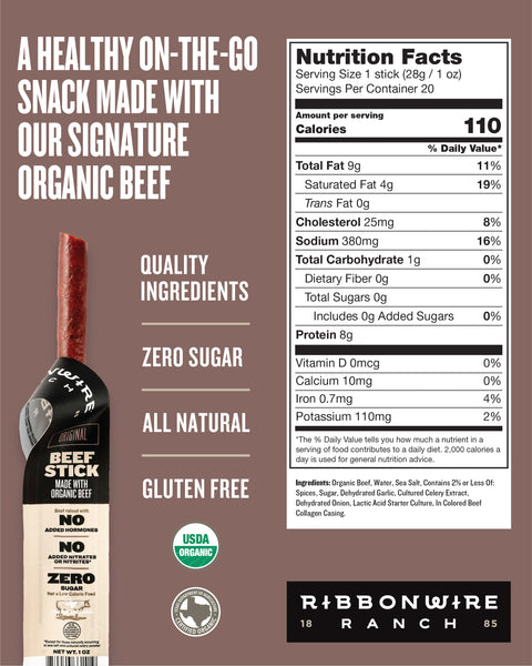 Ribbonwire Ranch Beef Sticks bring together simplicity, tradition, and robust flavor in one satisfying snack. Crafted from beef that’s born, raised, and finished on our family-run ranch in the Texas Panhandle, these sticks reflect a deep commitment to land, animals, and responsible ranching practices. From the beginning, we’ve believed in doing things the right way—no shortcuts, no artificial nonsense. That means no gluten, no MSG, no nitrites or nitrates, and no artificial colors or flavors—just real ingredients you can trust. Perfect for everyday snacking or life on the move, these beef sticks make it easy to stay satisfied wherever your day takes you. Whether you're heading out for a hike, working through a long day, or packing a lunchbox, they’re a practical, flavorful option you can feel good about. Each variety pack features a bold lineup of distinct tastes: the savory Original, the sweet heat of Sweet N’ Spicy, the smoky-sweet blend of Honey BBQ, and the zesty kick of Jalapeño. At Ribbonwire Ranch, we raise every animal with care and oversee every step of the process—from pasture to packaging. With every bite, you’re experiencing more than a snack; you’re enjoying the result of generations of hands-on work, a deep respect for the land, and a genuine love for what we do. Try all four flavors and enjoy the taste of something real.